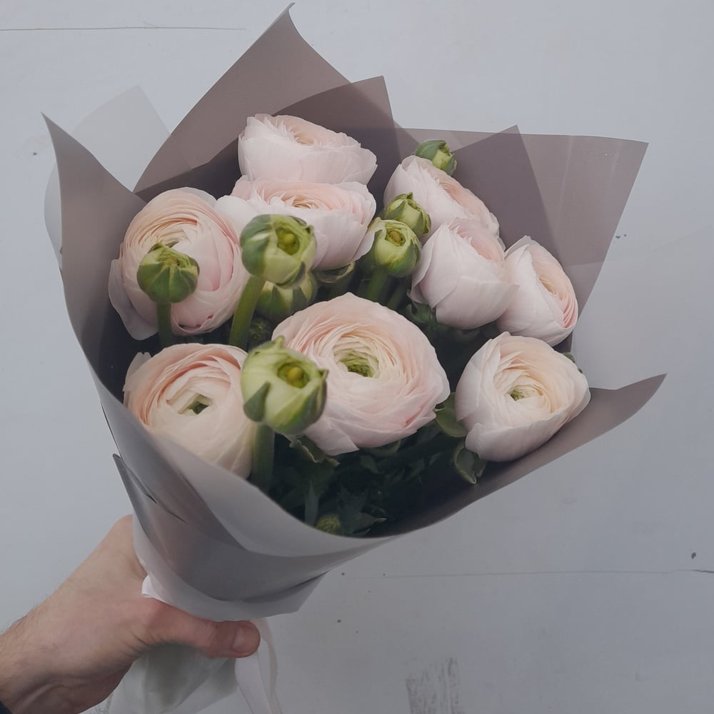 Букет из 9 нежно-розовых ранункулюсов сорт "Ханоя". Оформление в дизайнерской упаковке с атласной лентой.