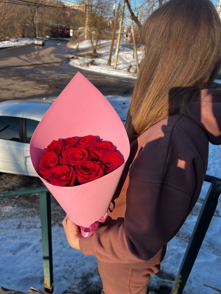 9 красных роз в упаковке