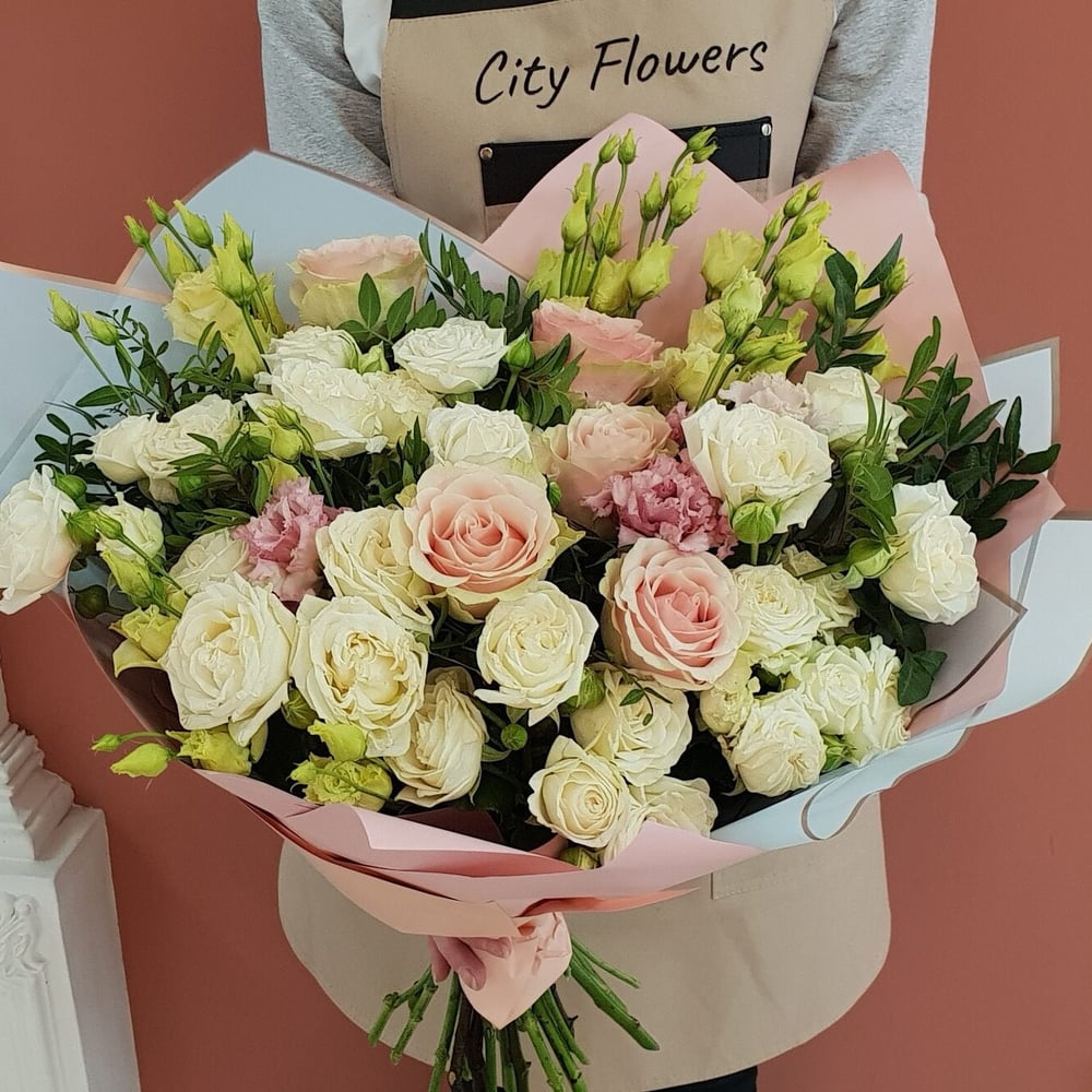 Букет с кустовой и одноголовой розой, эустомой и фисташкой, оформленный в фирменную упаковку и перевязан лентой. При отсутствии некоторых видов и расцветки цветов, компания оставляет за собой право осуществить равноценную замену по согласованию с заказчиком» Каждый букет и композиция может отличаться от исходного варианта, так как каждый букет и композиция уникальны и индивидуальны. Результат будет максимально приближен к образцу.