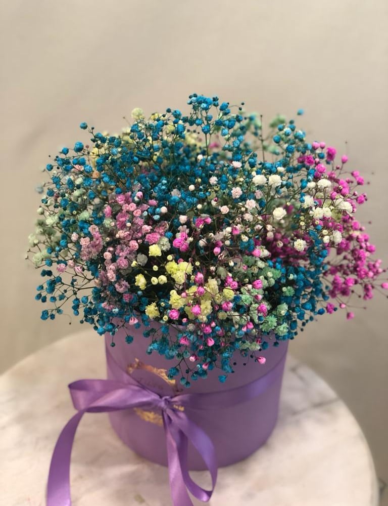 Шляпная коробка с цветами «Акварель» из гипсофил