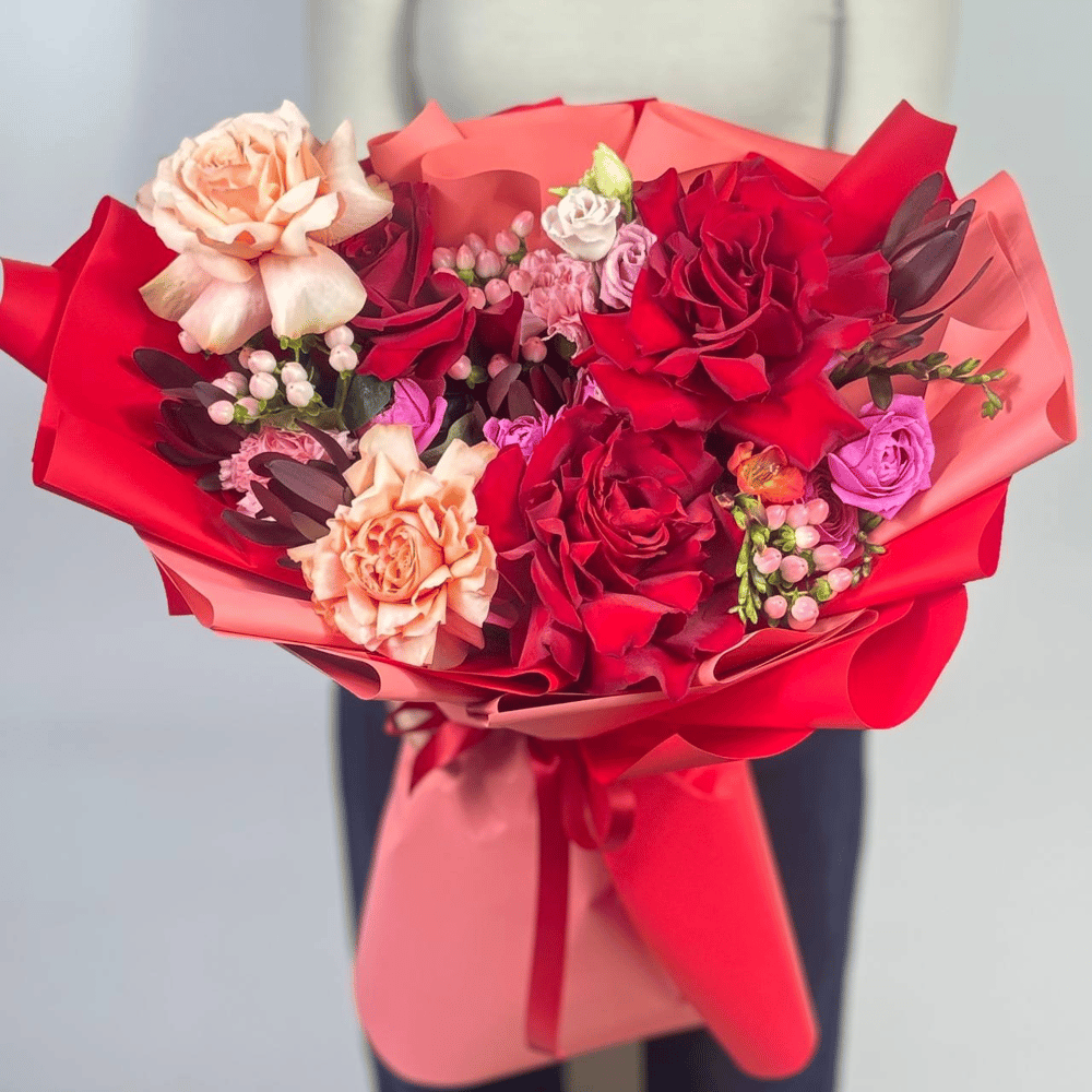 Этот роскошный букет – настоящая симфония страсти и любви, где каждый цветок рассказывает свою историю. Глубокие красные оттенки переливаются от нежно-розового до насыщенного бордо, создавая заворажи…
