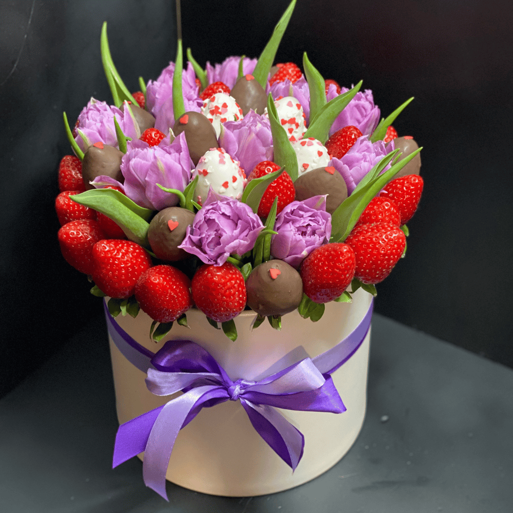 Клубника в шоколаде в шляпной коробке с тюльпанами
