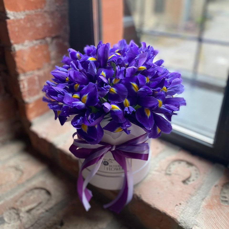 Шляпная коробка с цветами «Аллеган» из ирисов