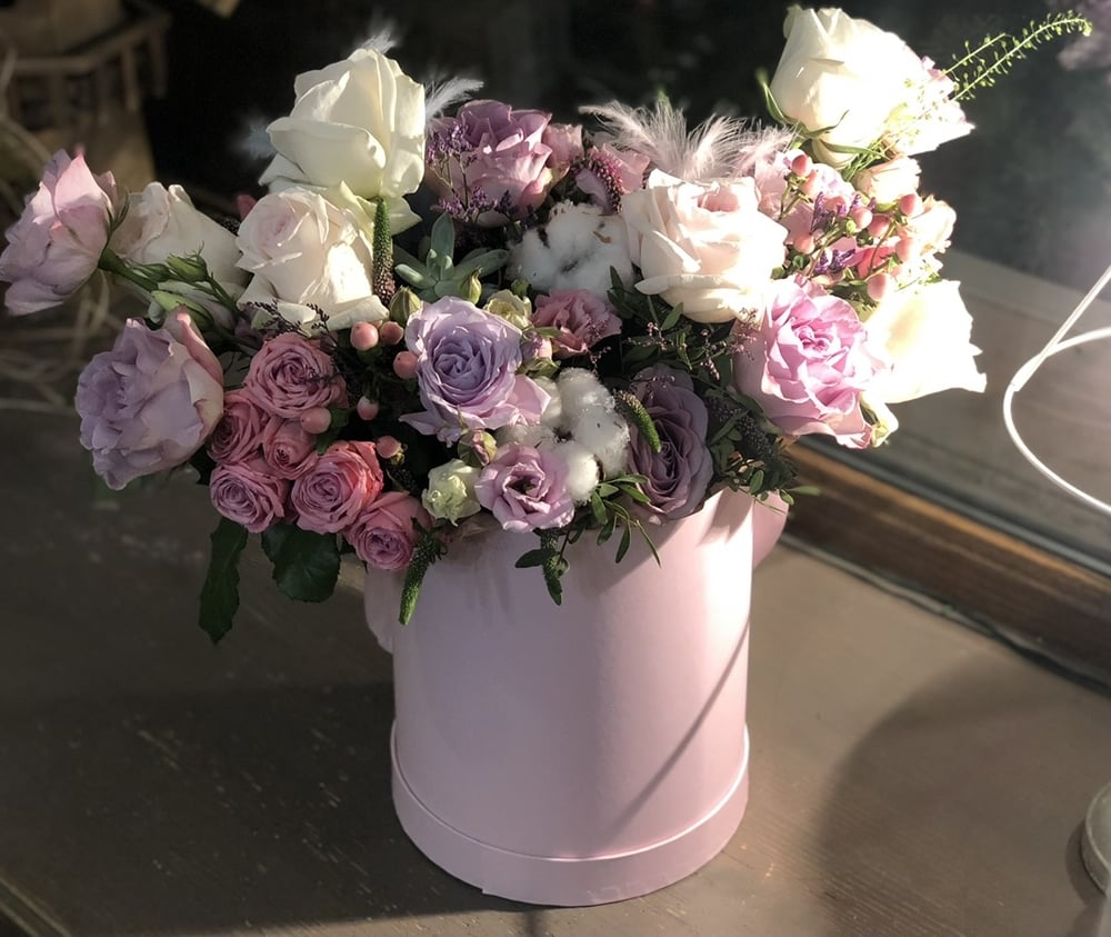 Шляпная коробка с цветами «Алонсо» из роз и эустом