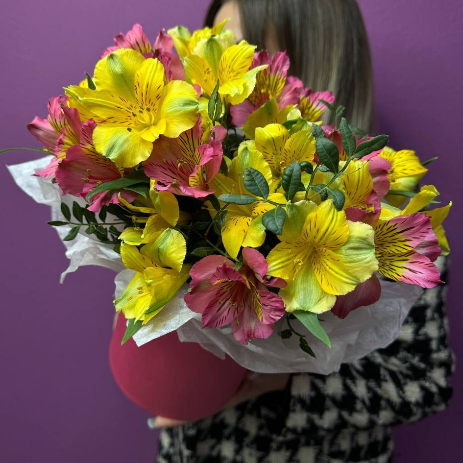 Шляпная коробка с цветами «Альстромерия в коробке»