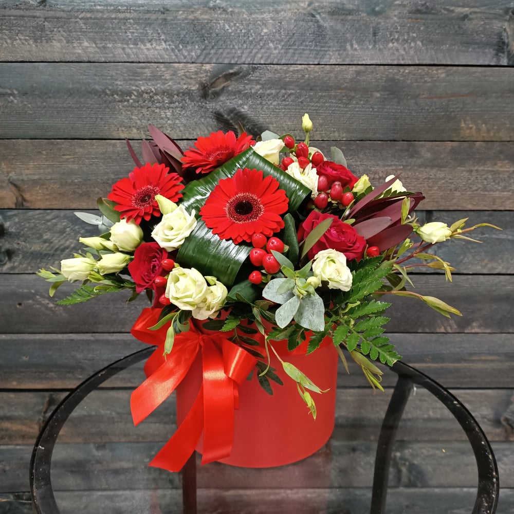Стильная шляпная коробка с красными герберами, лизиантусами и декоративной зеленью.