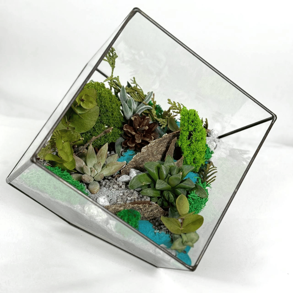 Стильный геометрический флорариум, вдохновленный красотой далеких галактик. Глубокий фиолетовый оттенок основания напоминает космическую пыль, а веточки бело-голубых цветов — сияние звезд. Живые раст…
