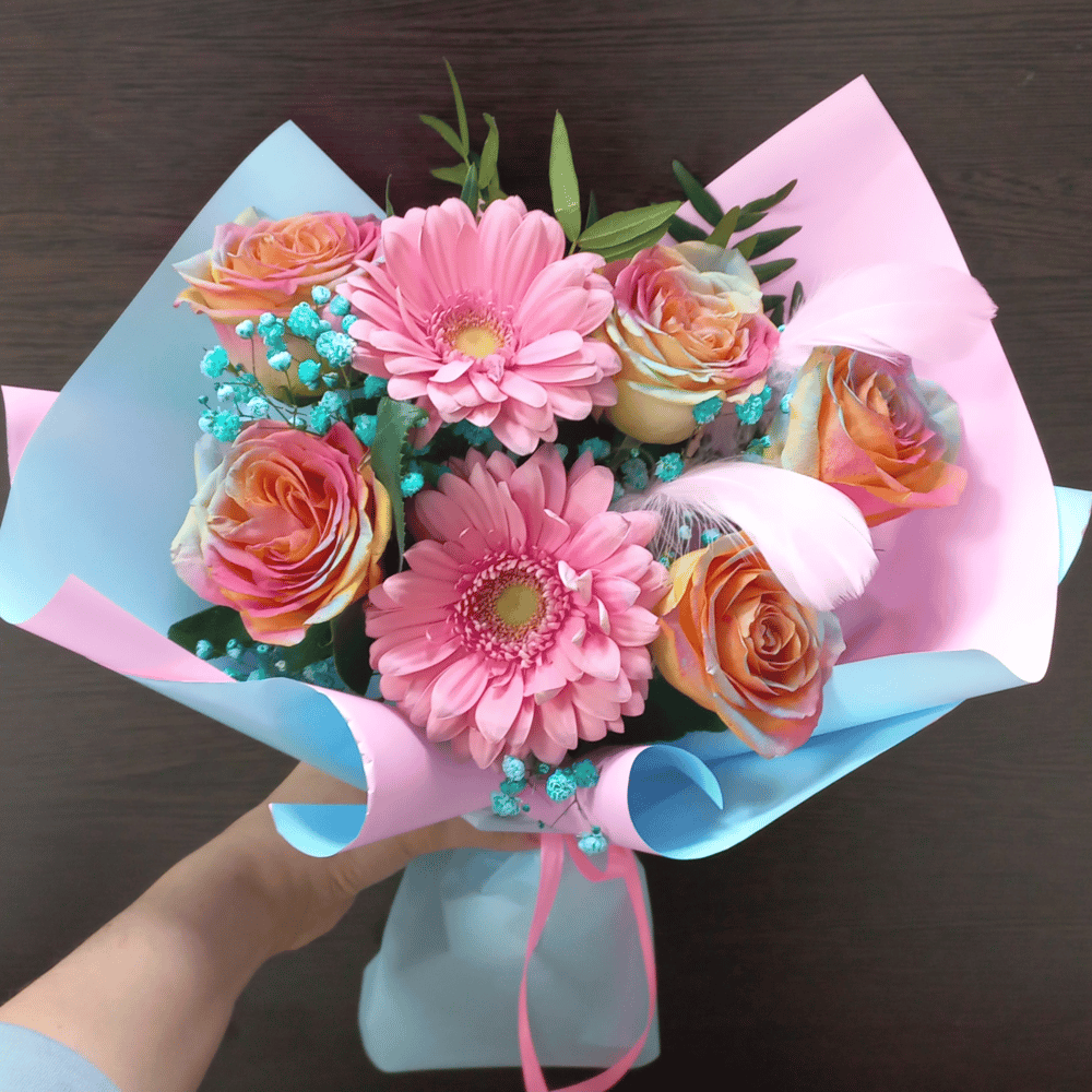 Букет, будто сошедший со страниц сказки. Розово-голубые розы, словно волшебные цветы, выросшие при лунном свете, обладают магической притягательностью. А герберы, как капли солнечного нектара, добавл…
