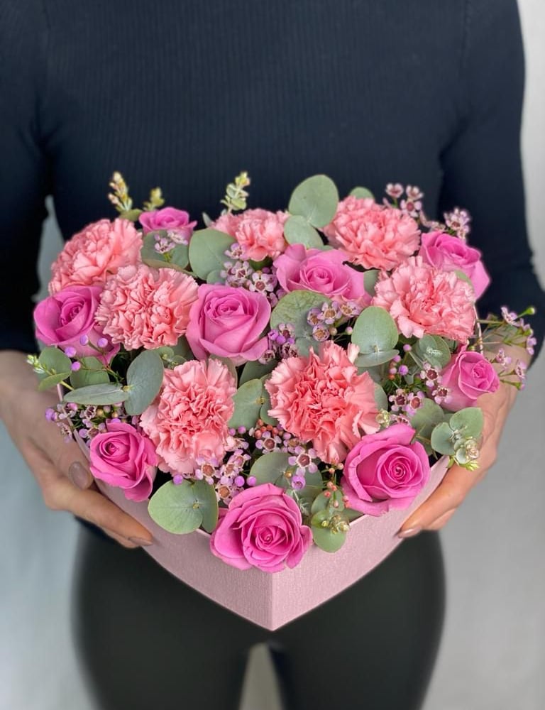 Диантус в переводе с греческого, цветок Зевса или Божественный цветок - величественный цветок, имеющий обширную символику и длинную историю, отличающийся стойкостью и приятным ароматом.Композиция в форме сердца, в сочетании с розой и ваксфлауэром порадует приятным цитрусовым ароматом