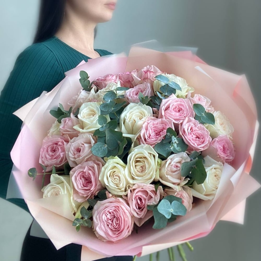 Букет из 29 пионовидных роз "Пинк Охара" и "Вайт Охара" с веточками эвкалипта Погрузитесь в мир изысканной красоты с нашим шикарным букетом из 29 пионовидных роз "Пинк Охара" и "Вайт Охара", доп...