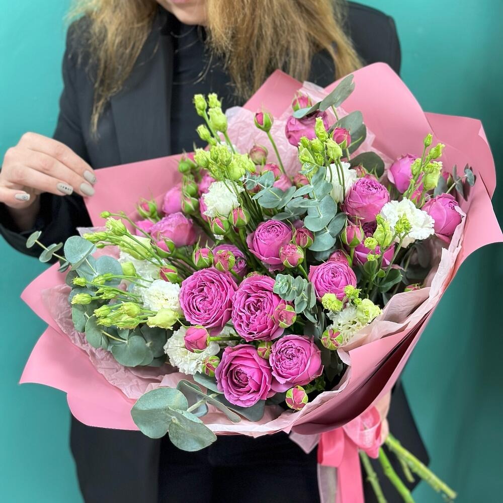 Кустовые пионовидные розы с белым лизиантусом и пудровым эвкалиптом - это бессменная классика в современном прочтении, которая будет близка каждой девушке🤍