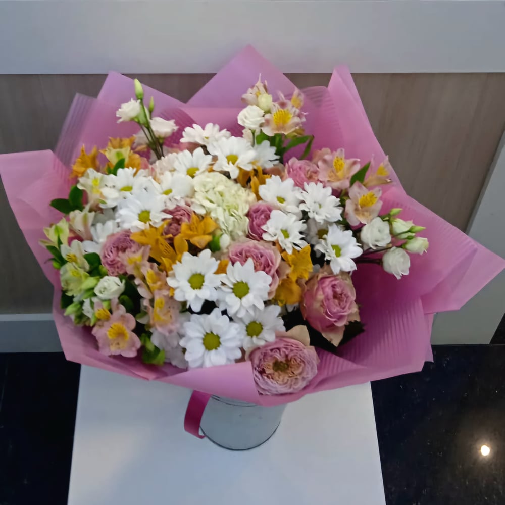 Букет в нежных тонах. Аврора - богиня утренней зари - именно в таких оттенках собрана эта композиция. Подойдет для любого возраста и по любому поводу - в букете есть сочетание всего: свежесть ромашковых хризантем (молодость) и грация пионовидных роз (мудрость), альстромерии же придают букету игривый характер. Также в состав букета входят гортензия и эустома. Отличный выбор как для коллег, так и для любимых и близких Стойкость наших букетов всегда на высоте. Только импортная срезка (Эквадор, Голландия). Гарантированно свежие цветы, всегда для вас и ваших близких и коллег С наилучшими пожеланиями, флорист Павел