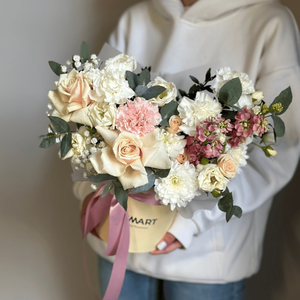 Шляпная коробка с цветами «Авторская коробка Джесси» из роз и гвоздик
