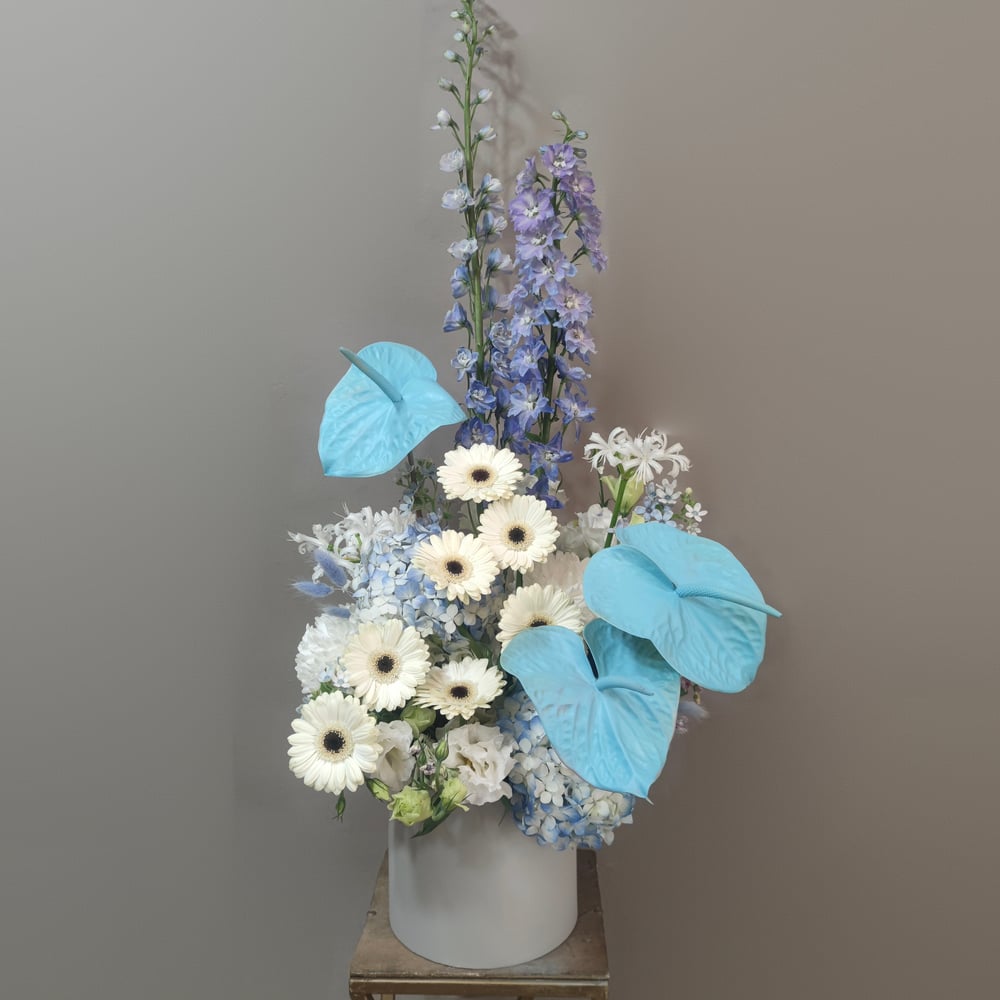 Авторская дизайнерская коробка Нежный Антуриум с дельфиниумом.