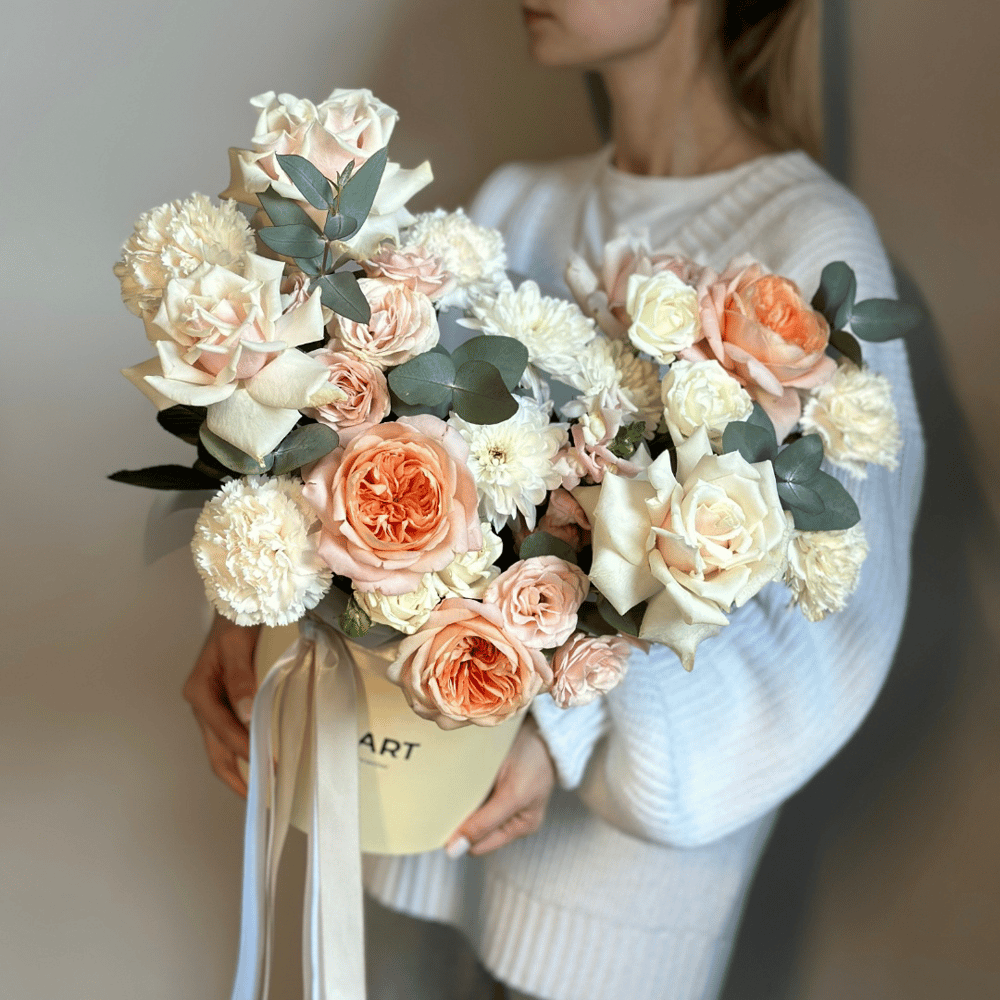 Шляпная коробка с цветами «Авторская коробка Венна» из роз и гвоздик