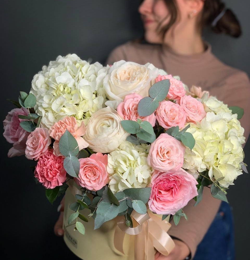Шляпная коробка с цветами «Авторская коробочка» из роз и гвоздик