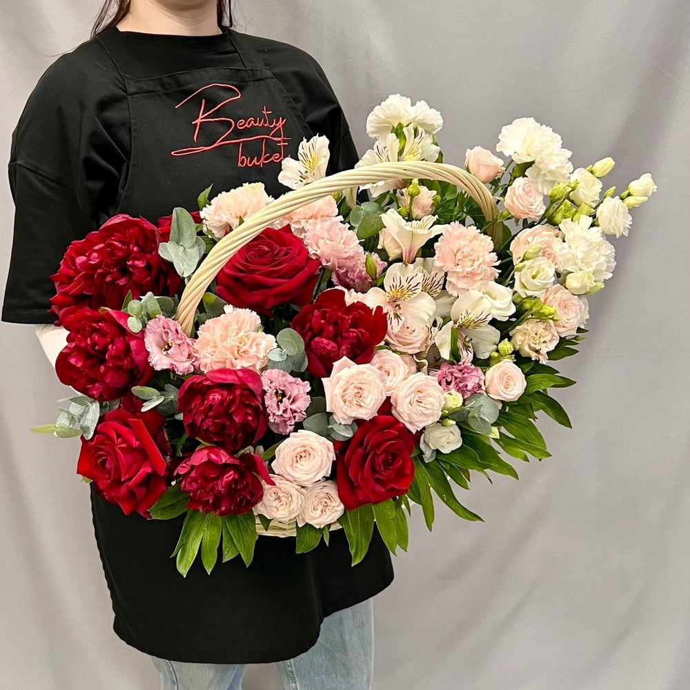 Авторская корзина с пионами и диантусами из гвоздик и роз
