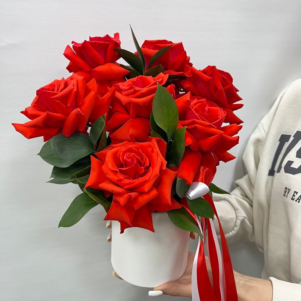 Состав букета: Коробка для цветов - 1 шт; Оазис - 1 шт; Роза эквадор 70 см - 7 шт; Рускус - 4 шт;