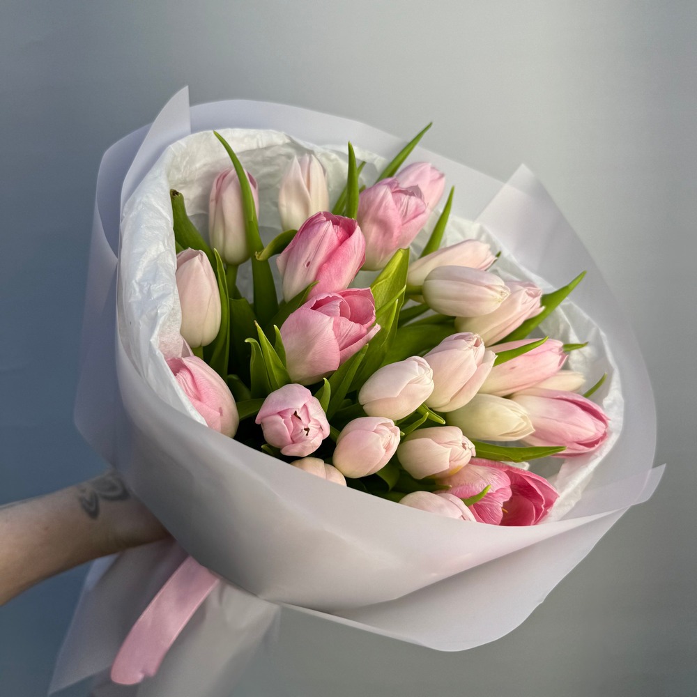 Состав букета: Авторская упаковка букета - 1 шт; Тишью - 2 шт; Тюльпан розовый - 25 шт;