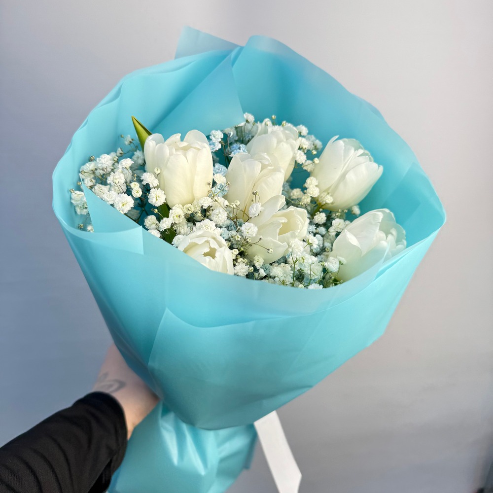 Состав букета: Авторская упаковка букета - 1 шт; Тюльпан белый - 7 шт; Гипсофила - 2 шт;