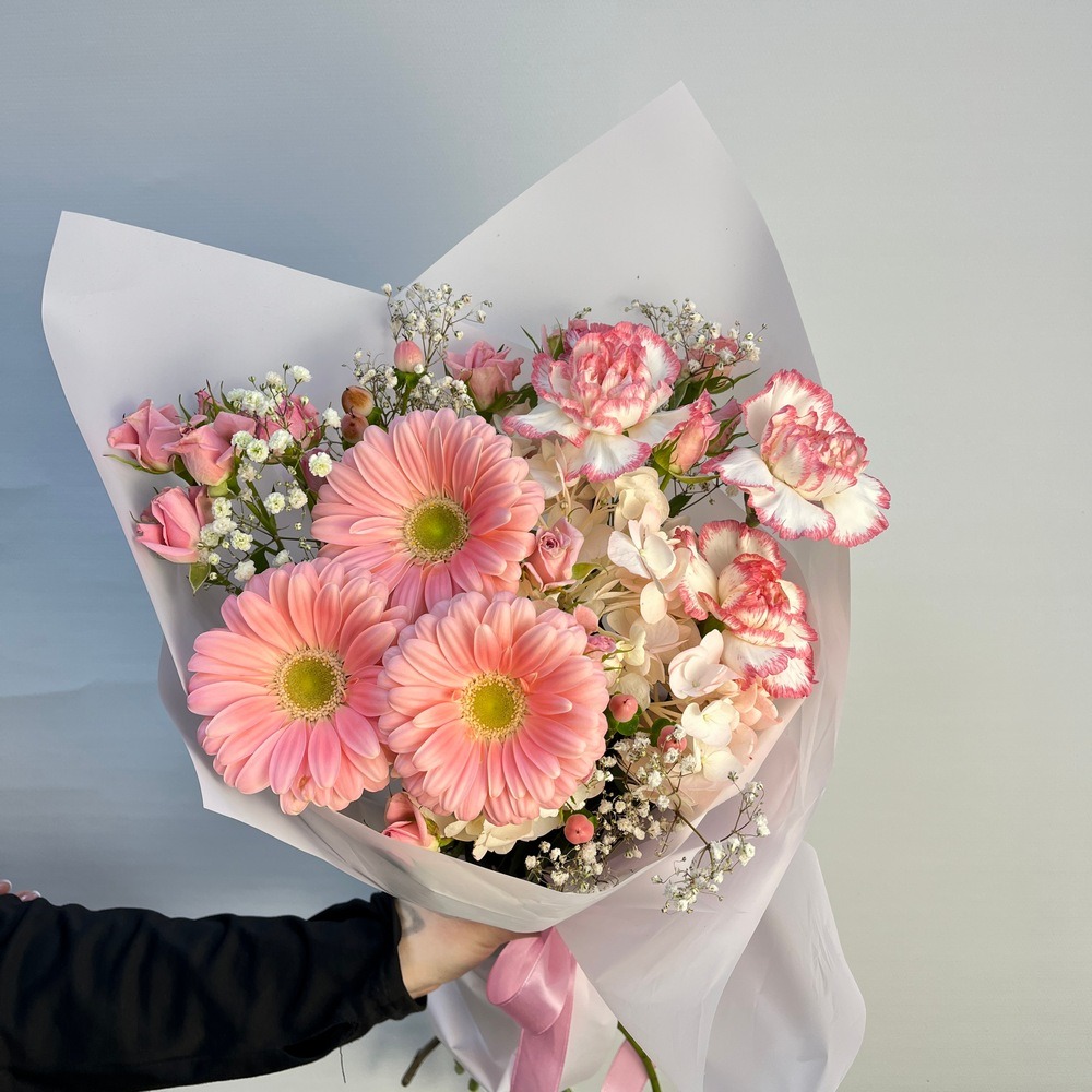 Состав букета: Авторская упаковка букета - 1 шт; Тишью - 2 шт; Кустовая роза розовая - 3 шт; Гортензия - 1 шт; Гипсофила - 1 шт; Диантус - 3 шт; Гербера - 3 шт; Писташ - 2 шт; Ги...