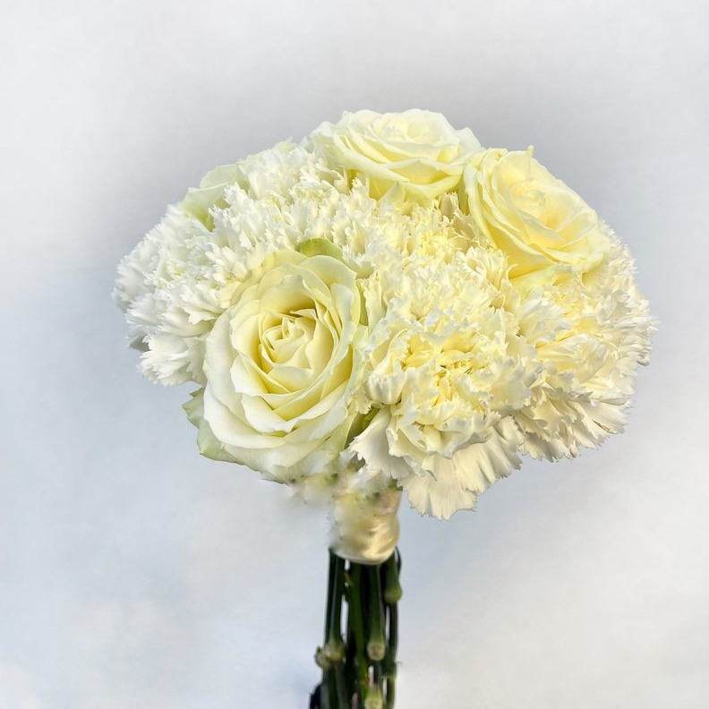 Состав букета: Роза белая 60 см - 5 Диантус - 10