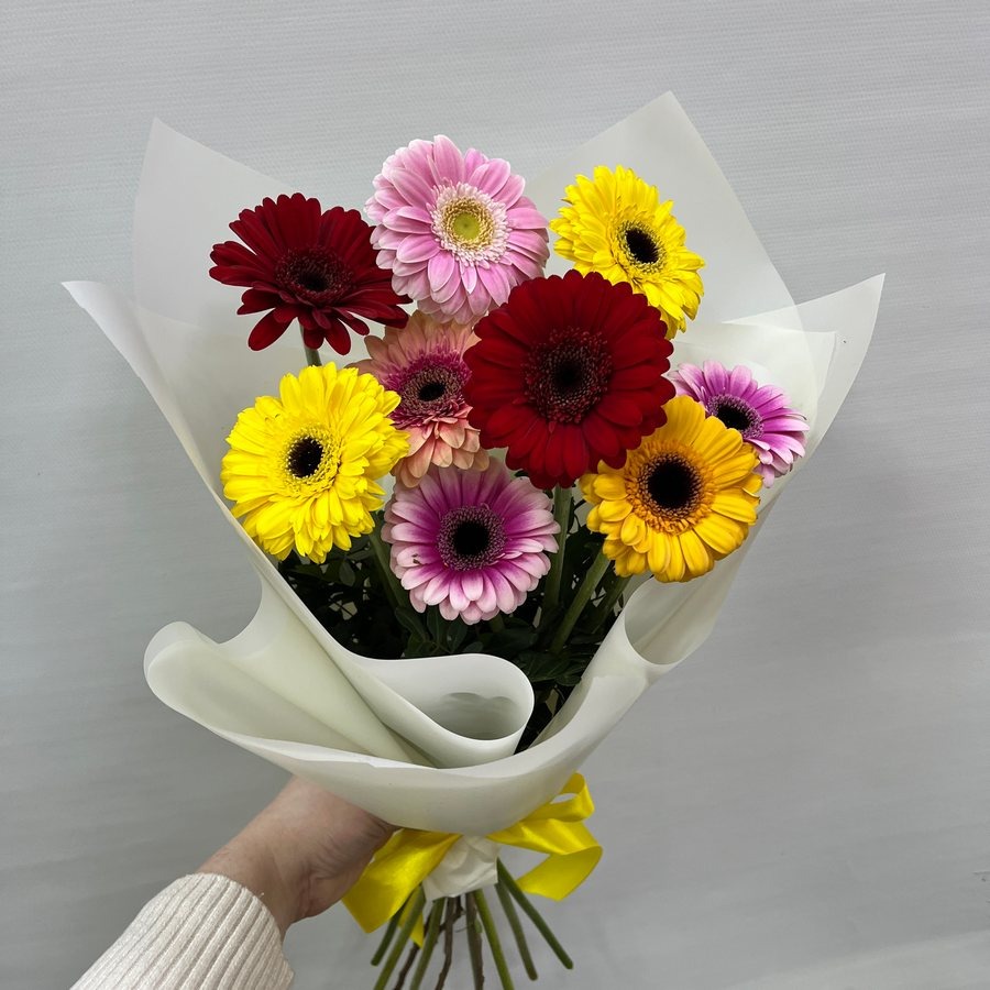 Состав букета: Авторская упаковка букета - 1 шт; Гербера - 9 шт; Писташ - 3 шт;