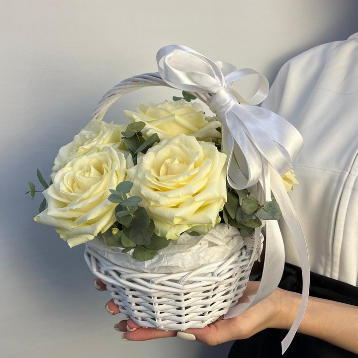 Состав букета: Оазис - 1 шт; Роза белая 60 см - 7 шт; Эвкалипт - 2 шт; корзина - 1 шт