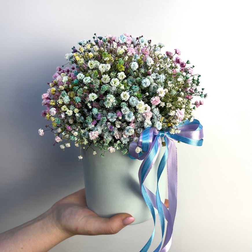 Шляпная коробка с цветами «Авторский букет 152 - радужная коробочка» из гипсофил