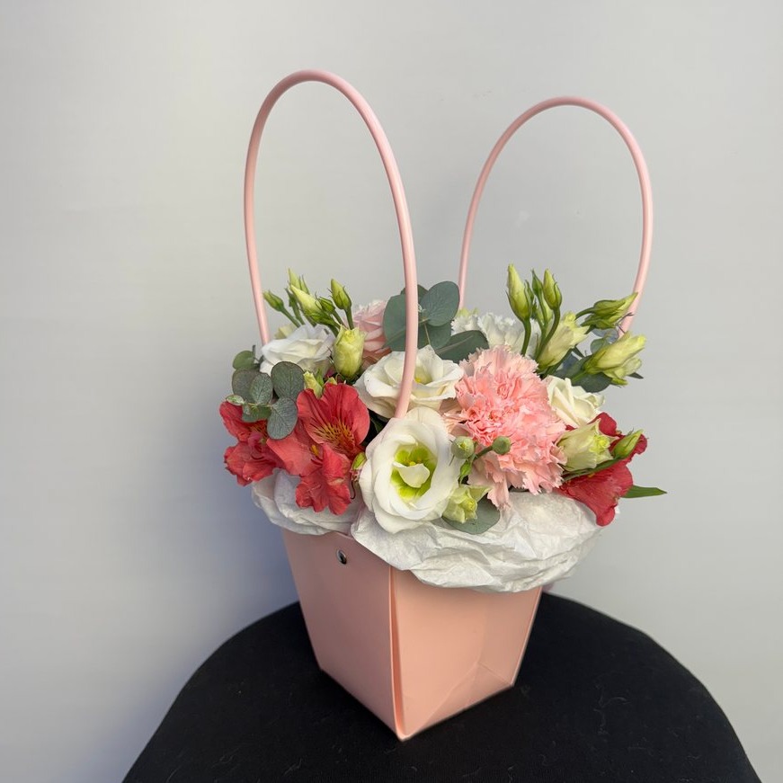 Состав букета: Тишью - 1 шт; Оазис - 1 шт; Роза микс 40 см - 2 шт; Альстромерия - 1 шт; эустома-1шт Диантус - 3 шт; Эвкалипт - 1 шт; пакетик - 1 шт
