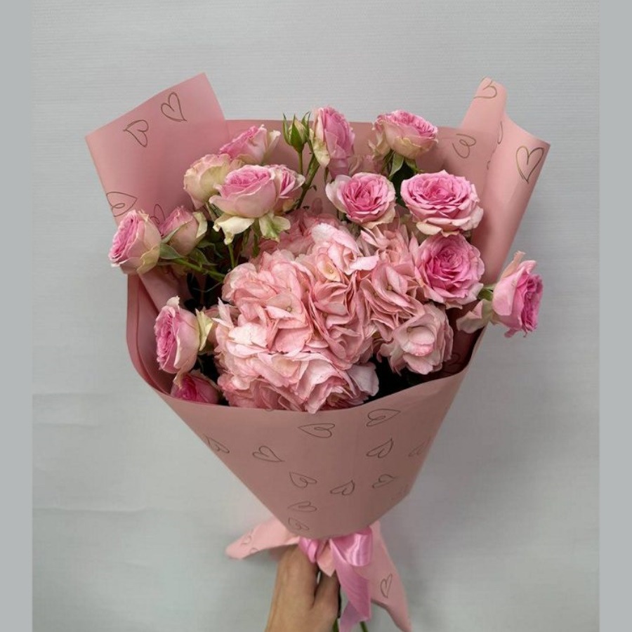 Состав букета: Авторская упаковка букета - 1 шт; Тишью - 2 шт; Кустовая роза розовая - 3 шт; Гортензия - 1 шт;