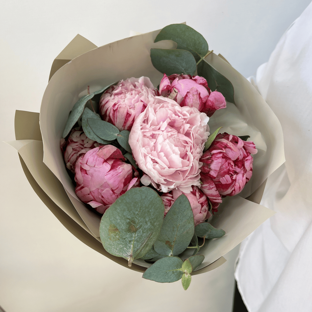 Состав букета: Авторская упаковка - 1 шт; Пионы - 7 шт; Эвкалипт - 1 шт;