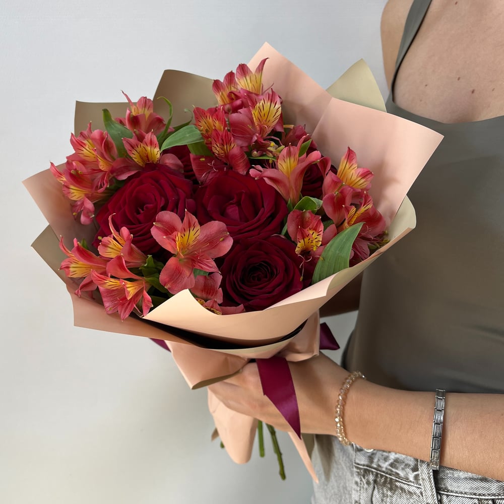 Состав букета: Авторская упаковка букета - 1 шт; Роза красная 60 см - 5 шт; Альстромерия - 4 шт;
