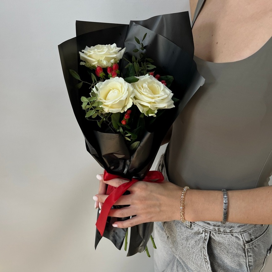 Состав букета: Авторская упаковка букета - 1 шт; Роза белая 60 см - 3 шт; Писташ - 1 шт; Гиперикум - 2 шт;