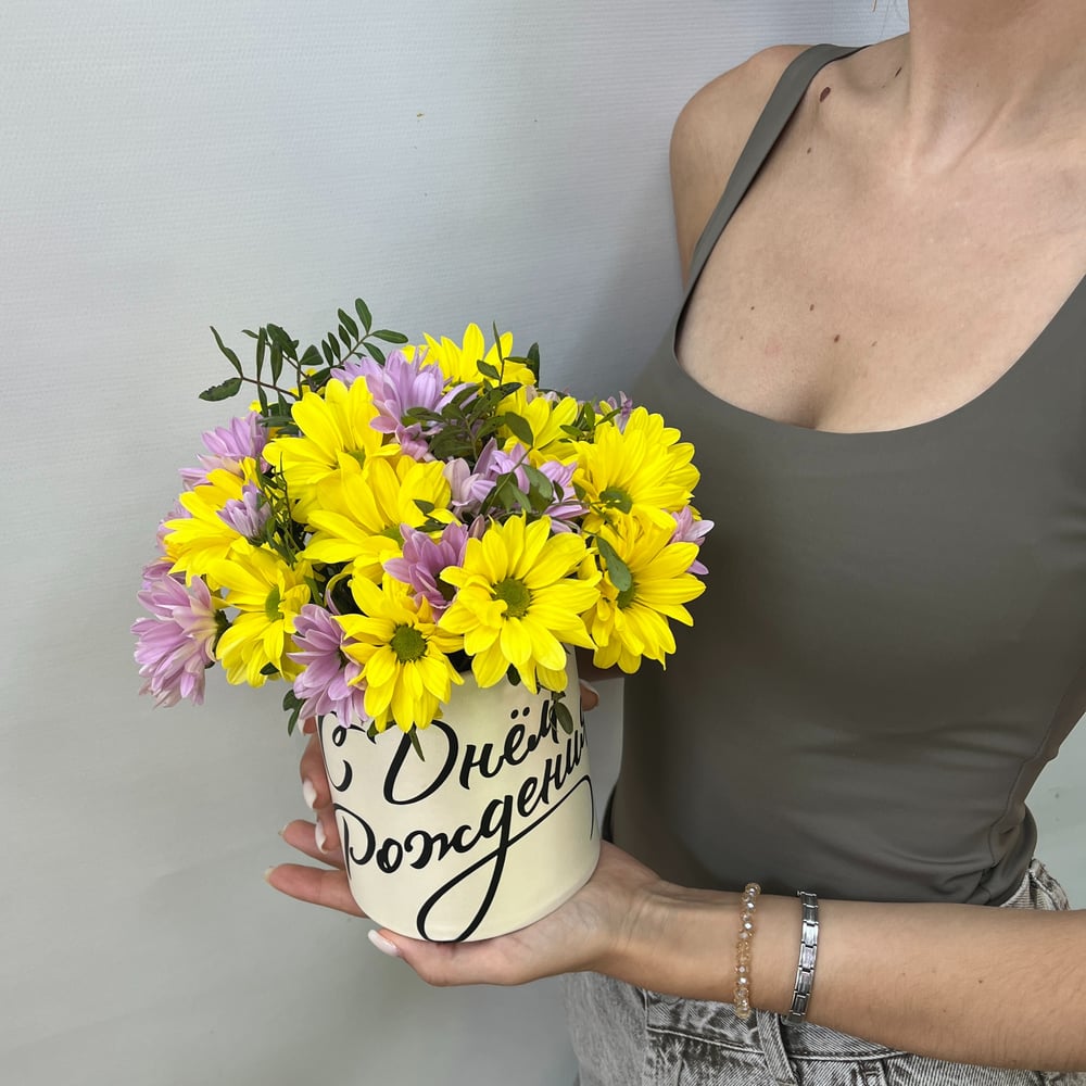 Состав букета: Коробка для цветов - 1 шт; Оазис - 1 шт; Надпись - 1 шт; Хризантема кустовая розово-фиолетовая - 2 шт; Хризантема кустовая желтая - 2 шт; Писташ - 3 шт;