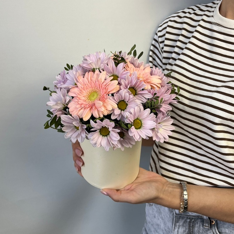 Коробка с цветами «Авторский букет 46 - ромашковое поле» из гербер и хризантем