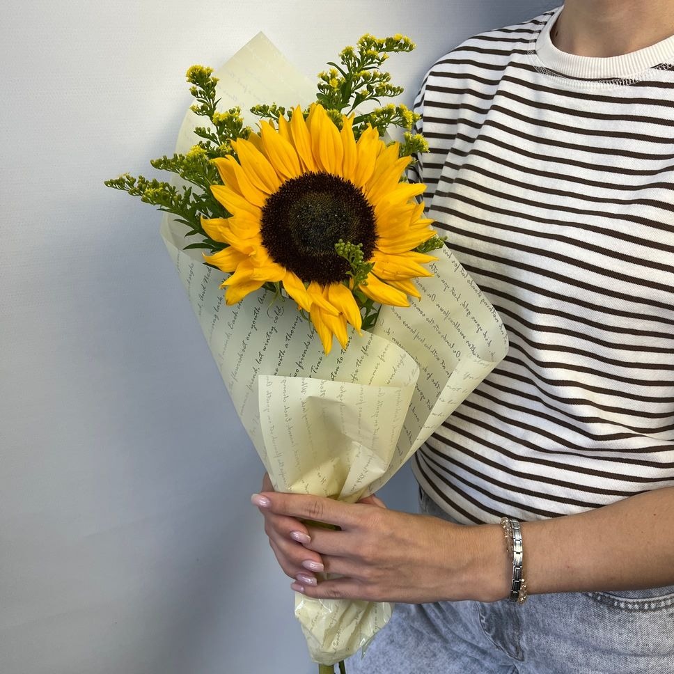Состав букета: Авторская упаковка букета - 1 шт; Подсолнух - 1 шт; Солидаго - 3 шт;