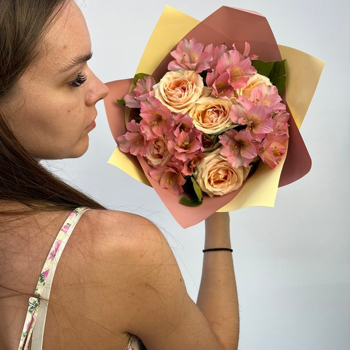 Авторский букет 6 - Для девушки, женщины из роз и альстромерий