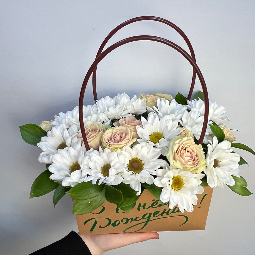 Коробка с цветами «Авторский букет 63 - С Днём рождения» из роз и хризантем