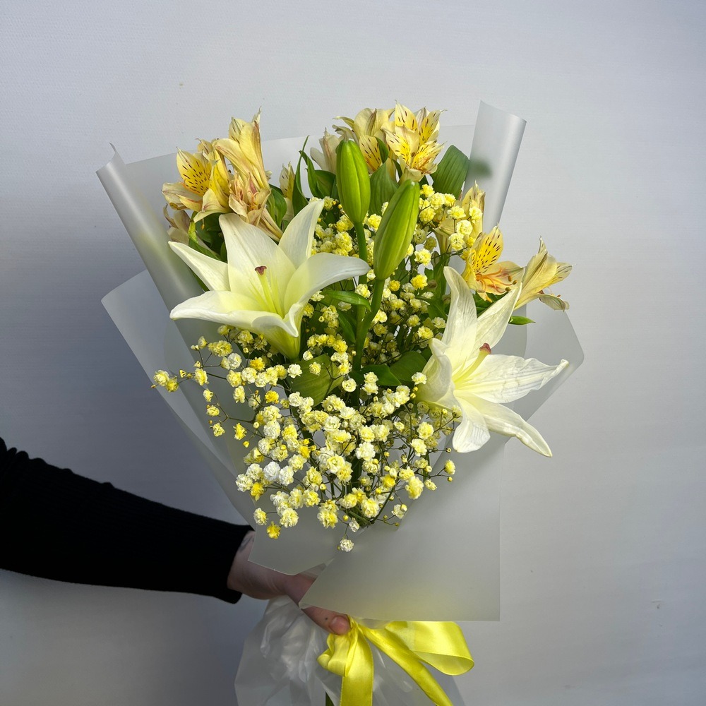 Состав букета: Авторская упаковка букета - 1 шт; Альстромерия - 3 шт; Гипсофилла - 2 шт; Лилия - 1 шт;