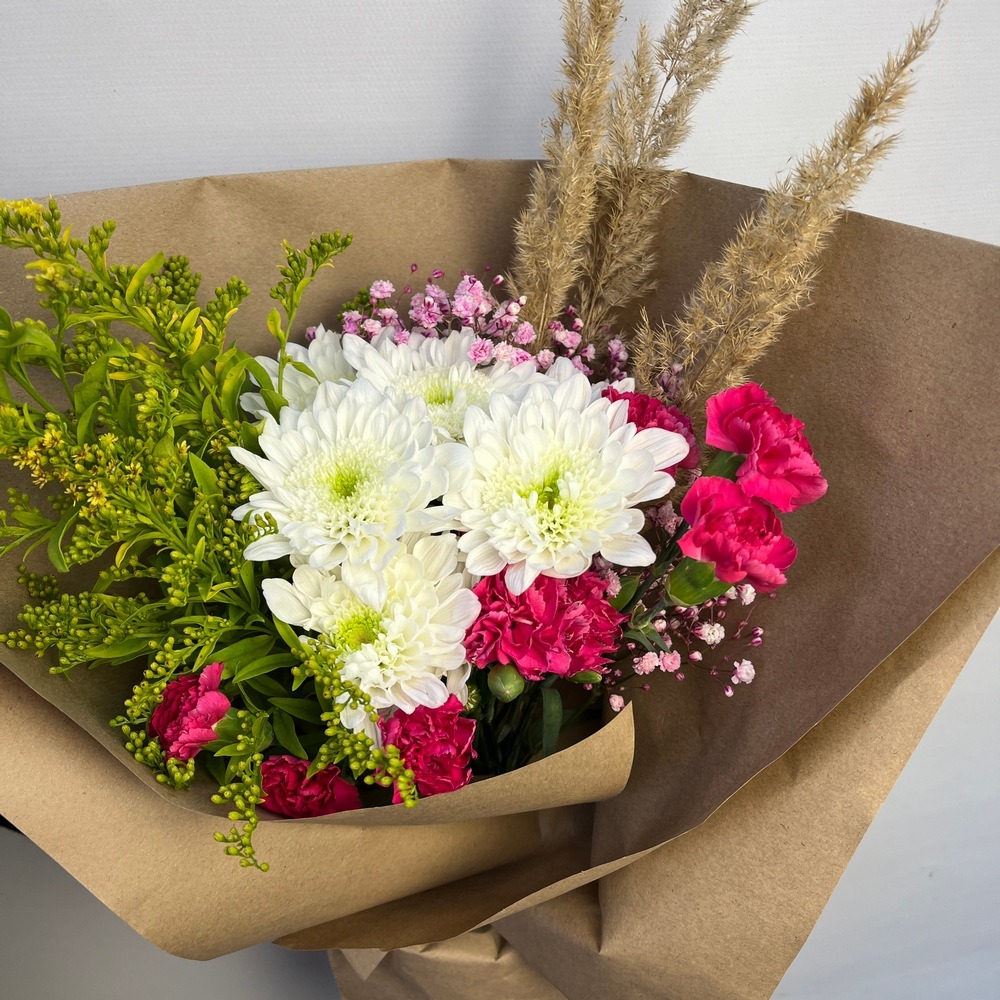 Состав букета: Авторская упаковка букета - 1 шт; Гипсофилла - 1 шт; Диантус - 2 шт; Хризантема кустовая белая - 1 шт; Колосок - 3 шт; Солидаго - 3 шт;