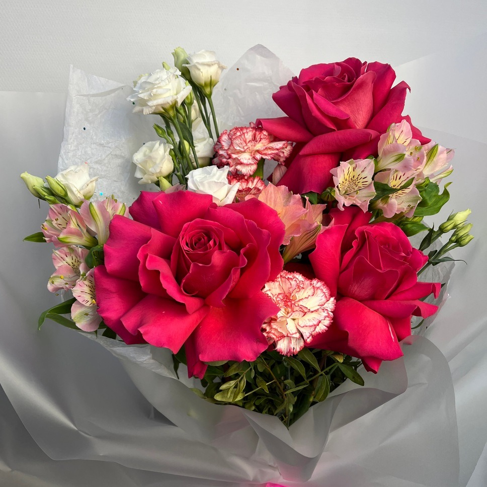 Состав букета: Авторская упаковка букета - 1 шт; Тишью - 2 шт; Роза эквадор 70 см - 3 шт; Альстромерия - 3 шт; Диантус - 3 шт; Эустома белая - 2 шт; Писташ - 3 шт