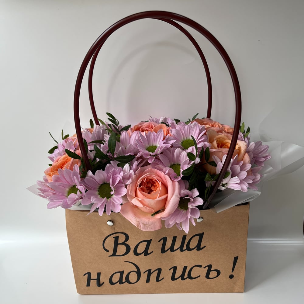 Корзина с цветами «Авторский букет 8 - С Вашей надписью» из роз и хризантем