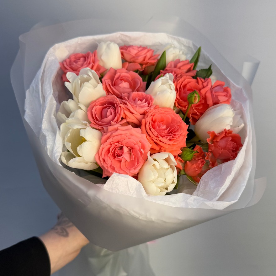 Состав букета: Авторская упаковка букета - 1 шт; Тишью - 2 шт; Кустовая роза пионовидная красная-оранжевая - 4 шт; Тюльпан белый - 7 шт;