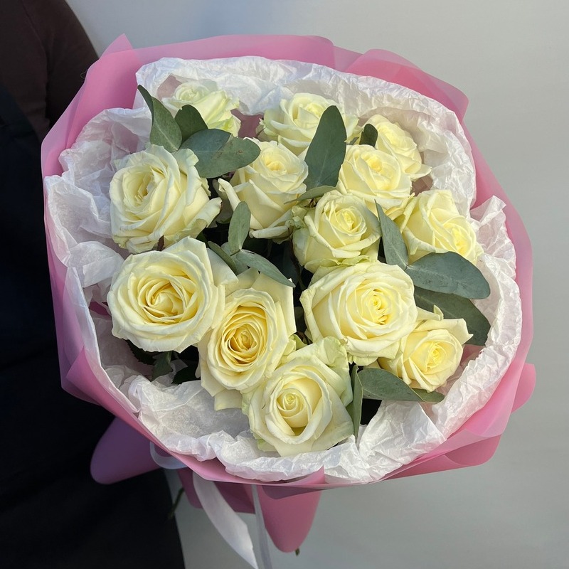 Состав букета: Авторская упаковка букета - 1 шт; Тишью - 2 шт; Роза белая 60 см - 13 шт; Эвкалипт - 3 шт;
