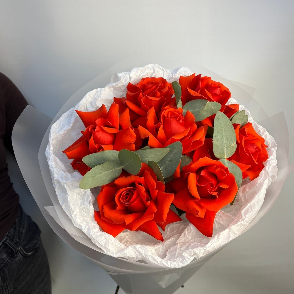 Состав букета: Авторская упаковка букета - 1 шт; Тишью - 2 шт; Роза эквадор 70 см - 7 шт; Эвкалипт - 2 шт;