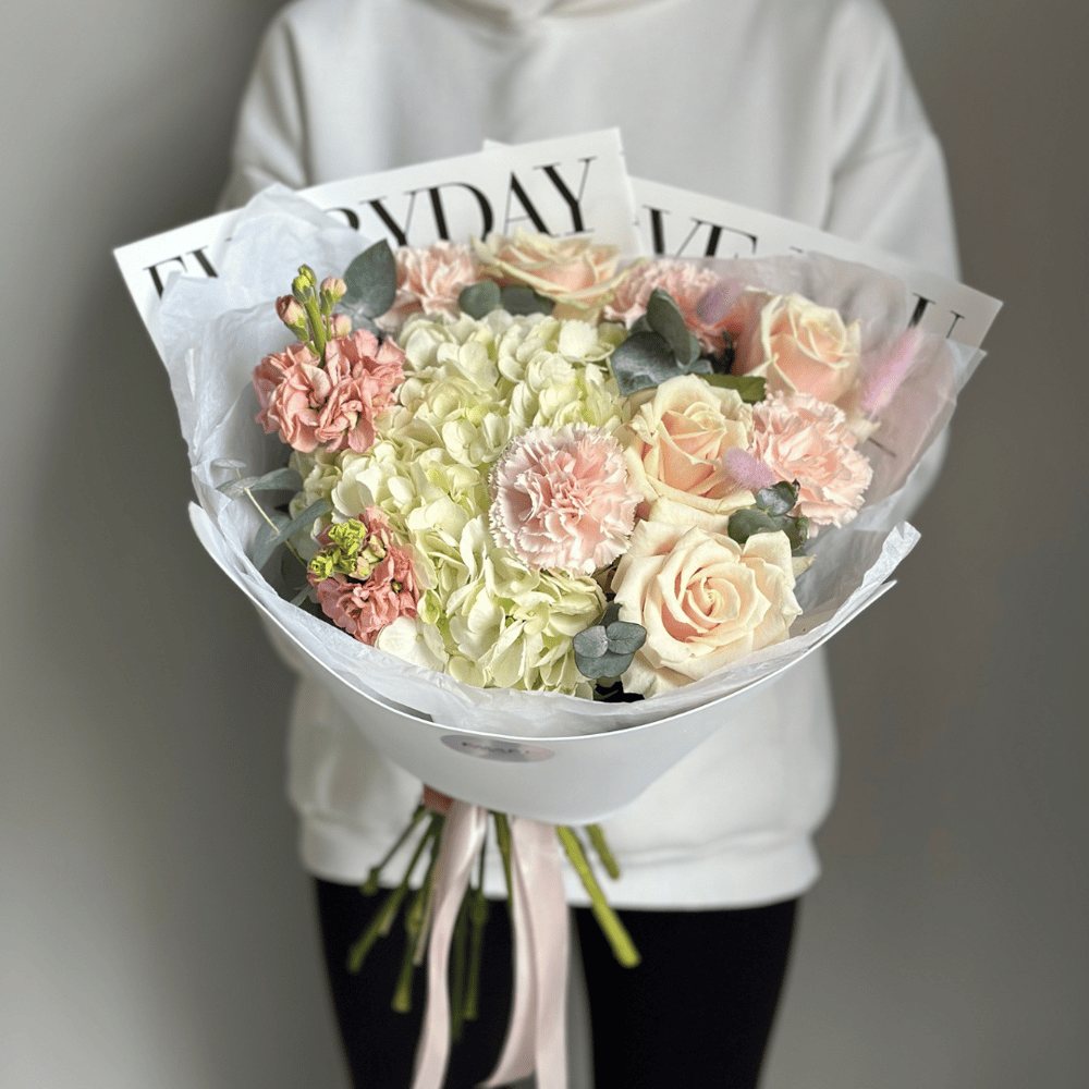 Это удивительное сочетание цветов и ароматов, которое создаст атмосферу волшебства и загадочности. В этом букете вы найдете нежную гортензию, символизирующую благодарность и понимание, розу, переда...
