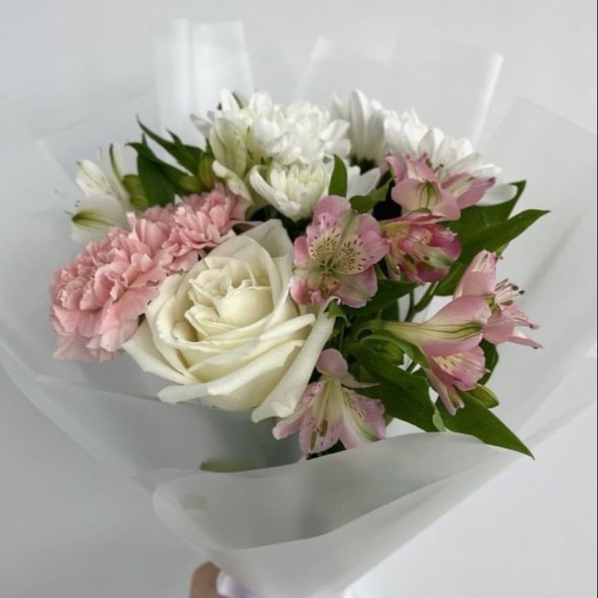 Авторский букет Белая роза из альстромерий и хризантем
