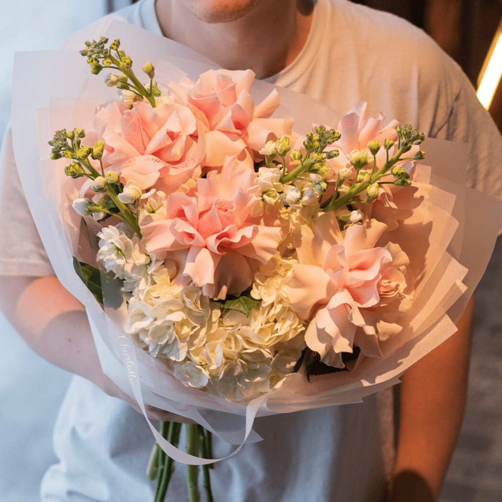 Букет из фирменных роз Charlotte, ароматной маттиолы и воздушной гортензии.