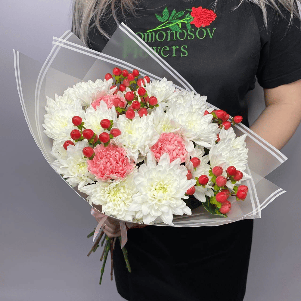 Авторский букет из белых хризантем, нежно-розовых гвоздик и красных ягодок гиперикума в белой упаковке. 🎁 В подарок к букету Вы получите: - фирменную открытку с Вашими пожеланиями - подкормку для срезанных цветов - инструкцию по уходу за букетом